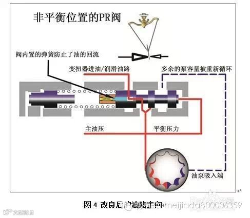 图3显示的增压阀带有2个密封圈,安装在增压阀套外壁,可以消除阀孔与阀套之间的泄漏。其次,我们可以改进主调压阀的设计,确保变速箱即便处于怠速或爬坡以及其它需要提升系统油压的情况下,主调压阀始终不会切断流向变扭器和散热器的流量。图3显示的是一种国外流行的改良设计,其内部有油路通道的主调压阀,这个内部通道将主油路和润滑油路连接起来,因此即便主调压阀处于极端的位置,润滑油路始终可以从主油路得到应有的流量,从而防止变速箱过热的问题。图4显示了使用这种改良型主调压阀后的油路走向。这种设计新颖而巧妙,使简单的更换即可解决问题的根源。