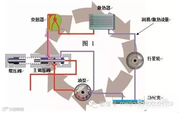 那么到底是什么原因导致了流经散热器的润滑流量不足呢?这就不是多数维修人员所了解的了。这里我们需要对自动变速箱的油路循环进行较深入的了解。从图1我们可以看到变速箱油从油底壳被油泵抽到阀体内,经主调压阀流经变扭器和散热器,经过散热器散热后又回到变速箱中,对行星轮等变速箱零件起到润滑作用。如果润滑流量不足,最先让人想到的原因是散热器被堵塞了。但是在4L80E变速箱中常见的问题根源并非来自于散热器或变扭器,而是阀体中的主调压阀的位置。