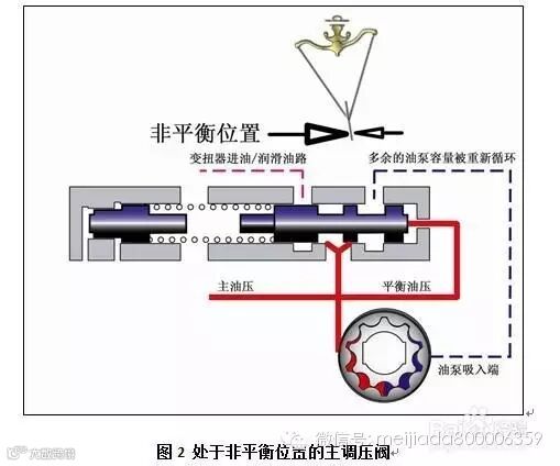 从图1可以看到,当主油压阀处于正常的平衡位置时,弹簧力和主油压相平衡,油从油泵进入主调压阀,一部分用来供给变扭器和润滑油路,多余的油则从泄油孔排出重新回到油泵。一旦在某种情况下需要提高油压,比如汽车在爬坡时,系统主油压需要提升,这时汽车加大油门,节气门信号油压增大,增压阀将信号油压增大,推动主调压阀往右移动,主调压阀进入非平衡位置(如图2所示),