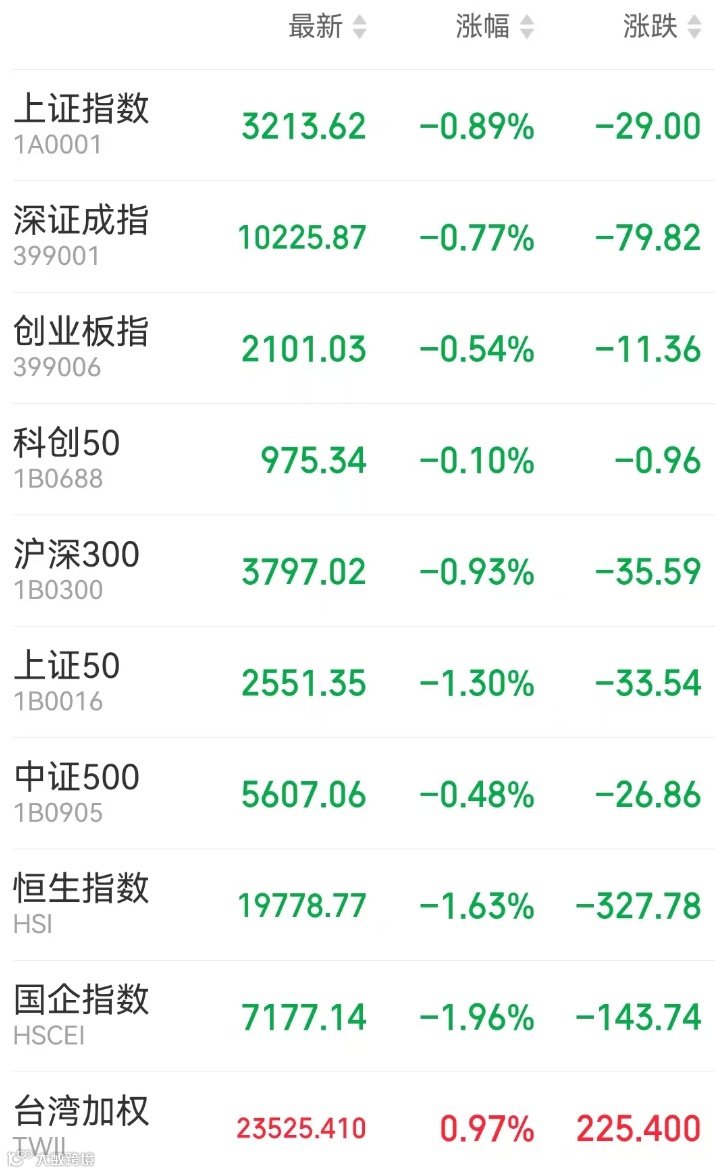 1、A股:周三A股低开低走,红利资产连挫4日,科技股逆势活跃,高速铜连、CPO、PCB概念强势。截止收盘,上证指数跌0.89%报3213.62点,深证成指跌0.77%,创业板指跌0.54%,北证50跌4.08%,科创50跌0.1%,万得全A跌0.91%。市场成交额1.15万亿元。