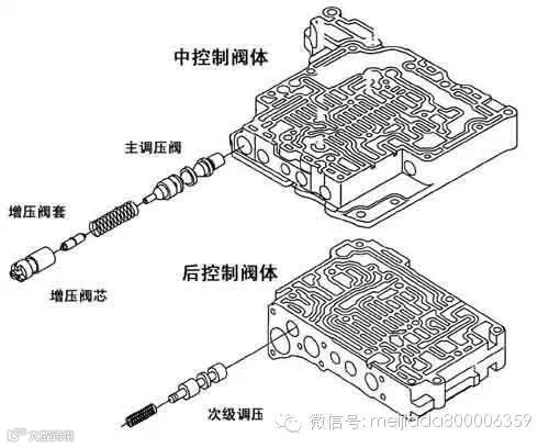 这款变速箱有2个调压阀:主调压阀位于4块阀体中的中控制阀体,与增压阀位于同一阀孔内,还有一个次级调压阀,位于下面的后控制阀体中(如图1所示)。这两处的磨损都会产生大致相同的故障现象,因此需要分别检查。