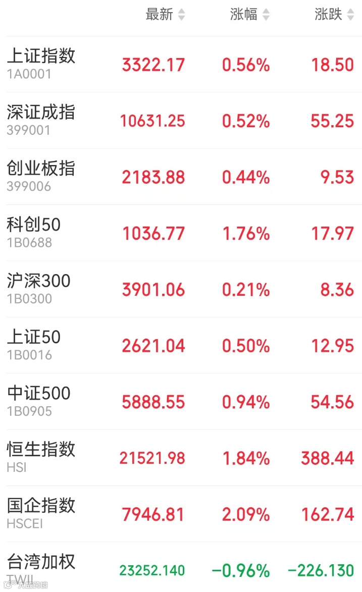 2、港股:香港恒生指数收涨1.84%报21521.98点,恒生科技指数涨2.65%,恒生国企指数涨2.09%。科技股领涨大市,阿里巴巴、美团涨近6%;AI医疗、人形机器人概念表现强势;三大运营商携手拉升,中国电信涨超4%创历史新高;影视娱乐股普遍上涨。此外,东风集团股份一度飙升85%创3年新高,最终收涨25.7%。大市成交2424.93亿港元,南向资金净买入164.68亿港元,盈富基金获净买入43.5亿港元居首。中国台湾加权指数收盘跌0.96%,报23252.14点。