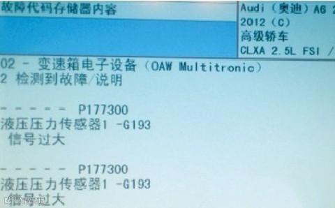 2012年产一汽-大众奥迪A6L(C7)轿车,发动机型号CLXA 2.5L FSI,功率140 kW,匹配8挡CVT变速器,型号:0AW,用户反映该车变速器故障灯报警(图1),挂入D或R挡,加速不走车。