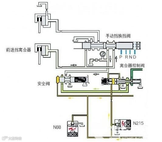 当离合器实际的压力明显高于离合器额定压力时,将进入安全紧急故障状态。此时由N88电磁阀控制SIV阀,不论手动换挡阀HS处于何位置或状态,离合器的压力都将被卸到油底壳中,离合器控制阀KSV提供给离合器的液压油被切断。