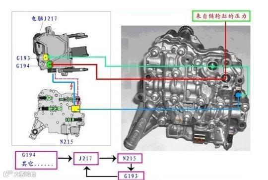 液压压力传感器1 G193,信号过大。如果在自动变速器液压压力传感器1-G193处检测到油压不可靠,便说明变速器内的油管在停车操作过程中被抽空。如果在重复尝试后,油压仍不正常,该故障便将被输入到故障代码存储器中。 其原因可能是离合器控制阀内金属屑堵塞。如果该故障条目无法清除,或在清除后再次出现,便应更新液压控制单元,并运行测试程序 02 - 更新液压程序。
