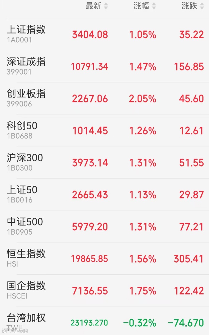 1、A股:上周五A股震荡攀升,全天超3600股飘红,核心资产迎来久违大涨,传媒板块全线走强,大金融冲高回落,消费题材股、光伏板块普遍低迷。截至收盘,上证指数涨1.05%报3404.08点,深证成指涨1.47%,创业板指涨2.05%,北证50跌0.97%,科创50涨1.26%,万得全A涨1.17%,万得A500涨1.29%,中证A500涨1.37%。市场成交额1.82万亿元。上周沪指累涨2.33%,深成指涨1.69%,创业板指涨1.94%。