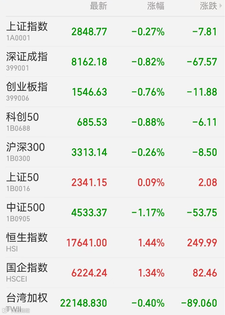 2、港股:香港恒生指数收涨1.44%报17641点,恒生科技指数涨2.16%,恒生中国企业指数涨1.34%。科技、金融、非必需消费板块涨幅居前,小米集团绩后大涨9%,友邦保险、东方海外国际涨近6%。医药医疗股走弱,石药集团跌超14%,爱康医疗跌近14%。大市成交974.08亿港元,南向资金净卖出8301万港元,小米集团-W遭净卖出12.67亿港元最多,石药集团获净买入4.02亿港元居首。中国台湾加权指数收跌0.4%报22148.83点。