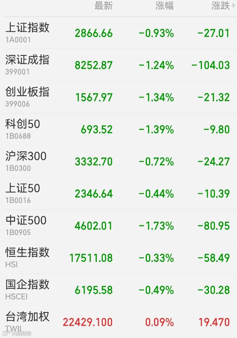 2、港股:香港恒生指数收跌0.33%报17511.08点,恒生科技指数跌0.54%,恒生国企指数跌0.49%。能源、地产、啤酒股走弱。个股方面,兖煤澳大利亚跌超14%,华润啤酒跌近6%,京东健康、平安好医生跌近5%。大市成交745.33亿港元,南向资金净买入17.94亿港元,盈富基金获净买入4.83亿港元居首,中国海洋石油遭净卖出1.75亿港元最多。中国台湾加权指数收盘涨0.09%报22429.10点。
