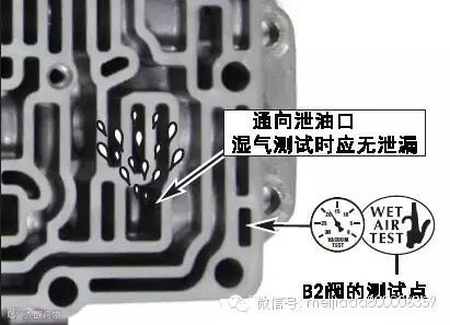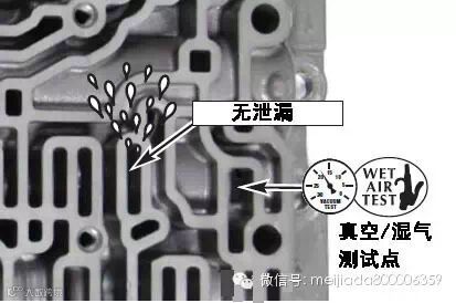 这个部位在检测时可以同时使用2种方法,一是目测阀套内壁的磨损状态,另一个是使用湿气或真空测试法。图3显示了湿气或真空测试点,如用湿气测试法,用少许ATF油滴入此测试点,然后用较低压力的压缩气通过湿气测试板对此开口吹气,在图中显示的泄漏点不应看到有ATF油被吹出,否则就说明此处的阀芯和阀套需要进行更换。如使用真空测试法,则在图中的测试点通过湿气测试板来抽真空,真空压力必须达到18英寸汞柱(30英寸汞柱=0.1MPa),否则说明此处必须修复。这里的修复方法也很简单,因为是阀套内壁和阀芯磨损,因此只需直接用图2所示的改良型阀套和阀芯进行更换即可,无需铰孔或任何机加工。