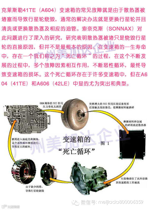 这里我们就看到所谓的“死亡循环”是如何形成的了:由于阀体中对变扭器的锁止压力控制有问题,导致变扭器锁止时大量摩擦材料解体形成磨屑,这些磨屑随着变速箱内的ATF油流入散热器,使散热器和散热油管中流量不畅,然后带有这些杂质的ATF油继续从散热器流回变速箱,并回到油底壳。