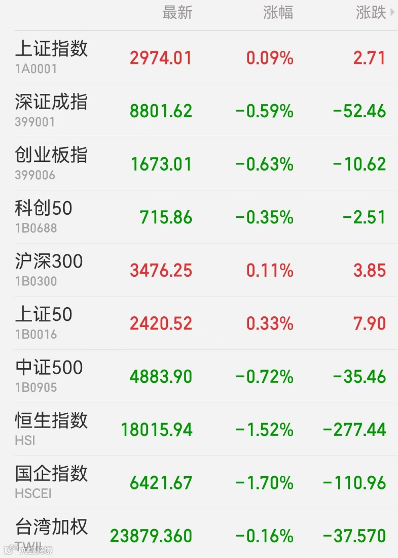 1、A股:A整体窄幅震荡,全天仅900股上涨,个股整体跌幅有限但做多动能严重不足,高股息资产全线反弹。截至收盘,上证指数涨0.09%报2974.01点,深证成指跌0.59%,创业板指跌0.63%,万得全A跌0.5%,万得A500指数跌0.14%。A股全天成交约6050亿元,环比再度收窄。北向资金净卖出29.4亿元,京东方A遭净卖出超7亿元。