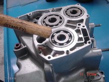 4、除变速箱尾盖里有3个惰轮外,其壳体内还有一个倒挡惰轮,在装配变速箱中壳时若合不上缝,不要用锤子敲击变速器壳,而应转动尾盖内的齿轮,待齿轮对正后便可顺利装入。同时,还要注意将变速箱各根供油管与壳体上的孔对正,若较难对正,可先拔下供油管,待壳体装配到位后,再从壳体的孔中一一插入供油管。