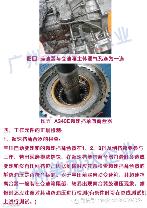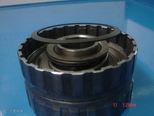 从上述施力装置作用表中可以看出,超速挡单向离合器(图五)负责防止超速行星排中的行星架左转,若损坏后打滑,则它负责的工作改由超速挡离合器负责,变速箱上所有的挡都还有,但因为超速挡离合器大部分只有2~3张摩擦片(个别的只有1张摩擦片),当车辆负荷急剧增加时(如:起步和急加速时),会出现超速挡离合器轻微打滑,若不及时更换超速挡单向离合器,会造成超速挡离合器连续烧蚀的现象。所以在维修丰田自动变速箱时,应注意检查超速挡单向离合器是否打滑,可先观察其磨损的状况,若磨损严重,应直接更换;若未发现明显磨损,也应进行加负荷的测试和检查。