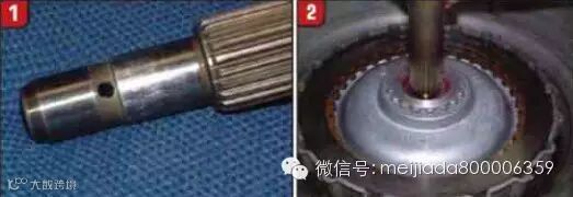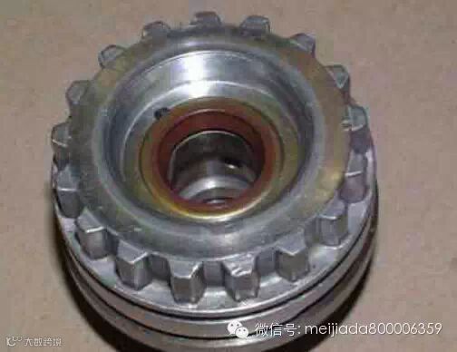 然而事情并未就此结束,虽然维修成功率大幅提高,但是偶而还是会遇到即便用了以上方法还是无法解决的入档抖动/熄火,或者锁止抖动的问题。技术专家进行了更深入的研究,发现722.6变速箱的输入轴在设计上容易与变扭器的定位孔磨损而产生泄压。图1所示的是722.6的输入轴,它的头部有2个不同直径的工作圆,前面的小直径的工作圆在插入变扭器前盖的中间定位孔后(如图2-1所示),就与孔内的小油封(图1中的#20项)形成油路的密封。然而直径稍大的那个工作圆在插入变扭器中间定位孔后则没有任何油封来进行密封,直接靠2个零件的配合间隙来进行密封。根据原厂的设计,新变扭器在这里的配合间隙应该是0.05mm,而在出问题的变扭器中,这里的配合间隙由于磨损而经常超出标准的10倍,达到0.5mm甚至更多,图2-2显示了这种泄漏情况,从输入轴流入的油压在这里被大量泄漏,经测量,一个0.5mm的间隙会产生大约每分钟7.5加仑(GPM)的泄漏量,导致变扭器的锁止油压出现异常。此外,包含这个中心定位孔的原厂零件是铝制的(图2-2中带齿轮的部分),正是这种材质常发生开裂,而开裂的地方仅从表面一般很难看到,需将此零件拆下才能看见。这里的开裂也直接造成了722.6变扭器的锁止故障。找到了这里的故障,就可以采用相应的修复方式。图3是改良后的替换件(SONNAX# MB-HB-1K),其内孔加上了一个唇型油封,这样当液压通过时会将油泵唇壁往中间挤,与输入轴形成很好的密封效果。很多修理厂在尝试这种方式后都反映维修效果明显,成功消除了入档熄火/颤抖和锁止故障。