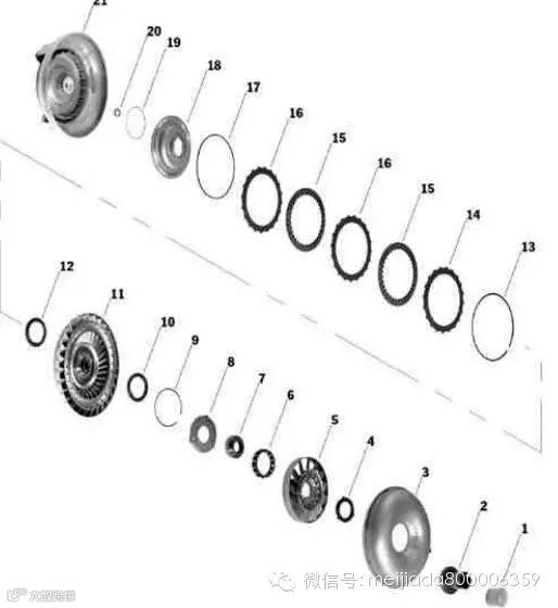 1-轴颈盖2-泵轮轴颈3-泵轮4-止推轴承5-导轮6-单向离合器7-导轮内轴圈8-导轮盖9-卡环10-止推轴承11-涡轮12-止推轴承13-卡环14-压盘15-摩擦片(2片)16-钢片(2片)17-活塞外油封18-锁止活塞19-内油封20-涡轮轴油封21-前盖