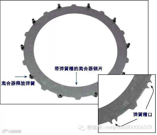 专家们想出了一个聪明的办法来克服这种变扭器没有专用锁止释放油路的缺点,他们将图1中的位于2片摩擦片之间的#16项的锁止离合器钢片替换为图4中的改良钢片MB-CP-10K(注意:图1中有2片#16钢片,只需替换位于2片摩擦片#15之间的那个钢片),这种改良钢片带有一圈小弹簧,即便变扭器前盖与锁止活塞之间的区域没有把油排干净,此钢片会将锁止离合器松开,防止在汽车入档结合时锁止提早作用,从而避免入档熄火和颤抖。此外,这种改良设计还提高锁止离合器的操作性能,降低锁止摩擦片的损耗速度。