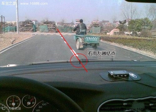 当我们的视线通过左雨刮器突起的结点和地面上的物体重合时,我们的左轮在行进时就会在该物体处压过。