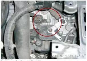 这一代索兰托车型配置的是型号为A6MF2的六前速自动变速器。通过对该车故障的检测和实际的路试情况,我们首先可以确定的是该车在动态行驶当中变速器的升挡和降挡过程是没有任何问题的,故障的范围仅限于将换挡杆拨到D挡位时的变速器冲击。这一故障现象的可能原因有换挡杆位置未学习,换挡拉线与挡位开关位置调整不良,挡位开关输入信号错误和D1挡位的换挡执行元件及相关油路故障。由于自动变速器系统存储有“P0705,变速器挡位开关电路故障”的代码,我们可以首先把故障范围圈定在变速器挡位开关的信号输入方面。挡位开关安装在变速器上部(如图所示)与手动阀操纵轴联动,属于滑动接触型开关。