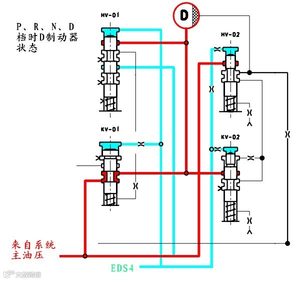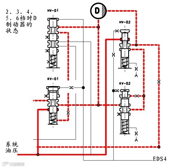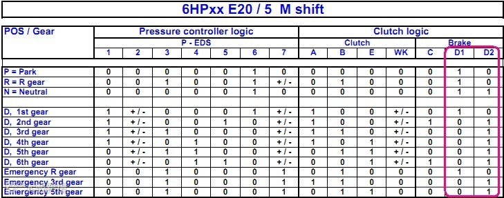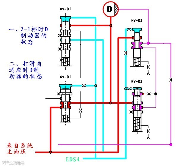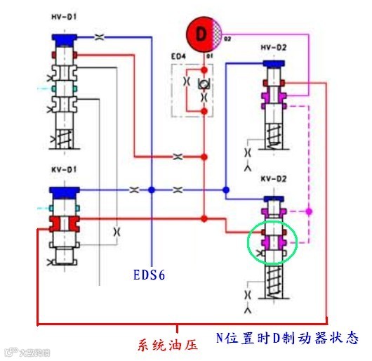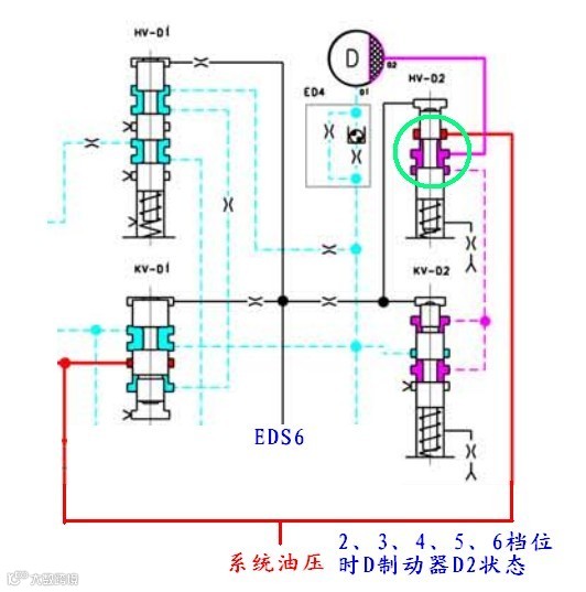接下来我们再从液压油路方面还看一下“D”制动器在不同档位下工作状态。其实就6HP-系列变速器目前来讲液压油路方面有4个版本(大体是两个版本新款和老款):老款两种即电子选档杆和非电子选档杆,新款也是两种也是电子选档杆和非电子选档杆。最为关键的并不是带不带电子挂档杆而是在于新款和老款的五个换档执行元件与之对应控制的高频率电磁阀上的区别,那就是在前面我们曾讲过的老款的6HP中EDS4号电磁阀既控制“D”制动器同时还控制“E”离合器,而新款的6HP当中“D”制动器则是由EDS6号电磁阀控制“E”离合器则仍然是EDS4号电磁阀来控制,所有元件均是采用独立控制式。其它的我们暂且不去了解就“D”制动器来说早期的EDS4是一个反比例控制类型的高频率电磁阀,而新型的EDS6则是一个正比例控制类型的高频率电磁阀,因此不同时期的“D”制动器的油路控制区别还是比较大。