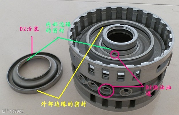 与离合器不同的是D2活塞内外均有密封圈(见图7)否则其也不会动作,它不像离合器那样能够旋转并借助动态离心压力来实现缓冲能力。D2活塞的外密封圈被安装在D1活塞的内测,内密封圈被安装在“D”制动器鼓上,这样在D1和D2之间就形成一个密封空间,当有油压进入时D2就会在D1上动作。D2动作后并不能使“D”制动器摩擦组件接合产生摩擦力。只有当油压作用到D1活塞室里“D”制动器摩擦组件才能正式工作产生足够的摩擦力将行星排中的行星架刹住,才能实现前进一档和倒档功能。很明显假如D2油缸先进油或与D1同时进油当D1动作时D2内的平衡压力就会给D1活塞移动时一个缓冲作用,最终得以该行星排中的行星架平稳刹住,这在变速器进行2-1档时起到了换档品顺的效果。另外D1单独工作时D2也不受影响,同时即便D2始终进油也不影响变速器各档位的切换,因此在“D”制动器进行打滑自适应和2-1档时D2都发挥了及其重要的作用。