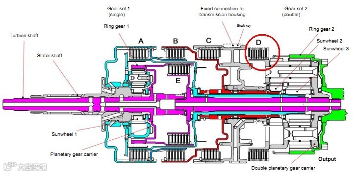 总而言之无论是打滑自适应功能还是换档自适应功能,电脑总是要学习电磁阀电流与阀门弹簧硬度以及终端元件所确定的压力之间的对应关系。“D”制动器打滑量由TCM根据输入轴转速传感器G182信号,通过精确计算涡轮转速获得,并由TCM控制电磁阀EDS-4的控制电流,使打滑量与电磁阀EDS-4控制电流之间,形成一较完美的比例关系,就算完成了之前我们所讲的打滑自适应学习过程(在维修时可观察相应的数据流组验证)。自动变速器在行驶过程中,除了换档点自适应外还会进行换档元件A、B、C和E的脉动自适应,也就是说各换挡元件根据实际控制需要,将被以脉动形式(即有节奏地)激活工作;由于“E”离合器负责输入轴与后排那维拉行星齿轮机构行星架的连接与释放,“E”离合器接合时方可实现4/5/6档动力传递功能,与“D”制动器没有条件冲突因此老款6HP-变速器的“D”制动器可与“E”离合器公用电磁阀EDS-4控制;那么电脑则采用封段记忆、档位激活的法则工作(通过该变速器油路图即可得知)。接下来我们通过“D”制动器的实物结合其工作油路再次进行学习总结。