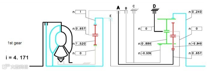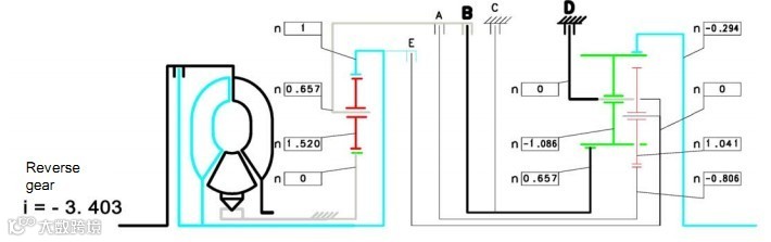 首先我们来认识一下“D”制动器这个元件在该变速器中的作用,在6HP-XX系列自动变速器中的“D”制动器,也称1/R档制动器,该制动器在P-R-N-D1档位置参与工作(见图2和图3);它负责后排那维拉行星齿轮机构行星架的制动与释放过程,当“D”制动参与工作行星架被制动时,即可实现D1/R档的动力传递功能。