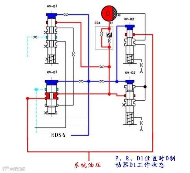 在老款6HP系列变速器当中并没有对“D”制动器的D1和D2有过多的描述,无论从“D”制动器机械结构还是从其液压油路中分析,都要比新型6HP系列(D是独立控制)中“D”制动器的控制策略差得很多。所以说“D”制动器的D1和D2更容易在新型6HP当中显而易见的暴露出其设计机理来。这样我们就分别从“D”制动器的老款与新款油路中来探索其设计上的真正用意。首先我们来看早期6HP的“D”制动器油路的接合与释放过程,从换档执行元件工作分配表得知“D”制动器是在P、R、N、D1位置工作的(见图9和图10),而在其它档位均是分离状态,同时也并没有对“D”制动器的D1和D2有任何说明。这样我们具体来了解一下“D”制动器在不同档位的状态,在P/N启动发动机时“D”制动器瞬间接合由于无其它元件参与因此无动力传递过程不必考虑其因压力的高低或与接合速度的关系而引起车身的振动,但由于“D”制动器的工作加之车辆输出部分是处于静止状态,因此也会给输入部分的涡轮一个很小的扭矩扰动,这样电脑也会对“D”制动器的接合有一个压力调节的自适应过程。