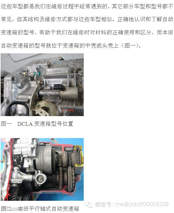 这些车型都是我们在维修过程中经常遇到的,其它部分车型和型号都不常见,但其结构及维修方式都与这些车型相似。正确地认识和了解自动变速箱的型号,有助于我们在维修时对材料的正确使用和区分,而本田自动变速箱的型号就位于变速箱的中壳或头壳上(图一)。