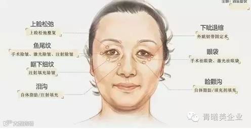 后期衰老 45岁八字眉,眼袋、泪沟、睑颧沟明显,鱼尾纹、眶下细纹明显。更会发生双颊松弛,眼尾眉部下垂形成。 细纹,皱纹,眉毛下垂,眼皮下垂,皮肤变薄,眼袋这些都会给人一种老态。这些变化在大约三十岁的时候就逐渐显现出来。衰老的过程和老化的痕迹似乎都会减损眼睛的美丽。一旦,我们决定着眼于无创眼部整形,就要选择适合自己的方式。
