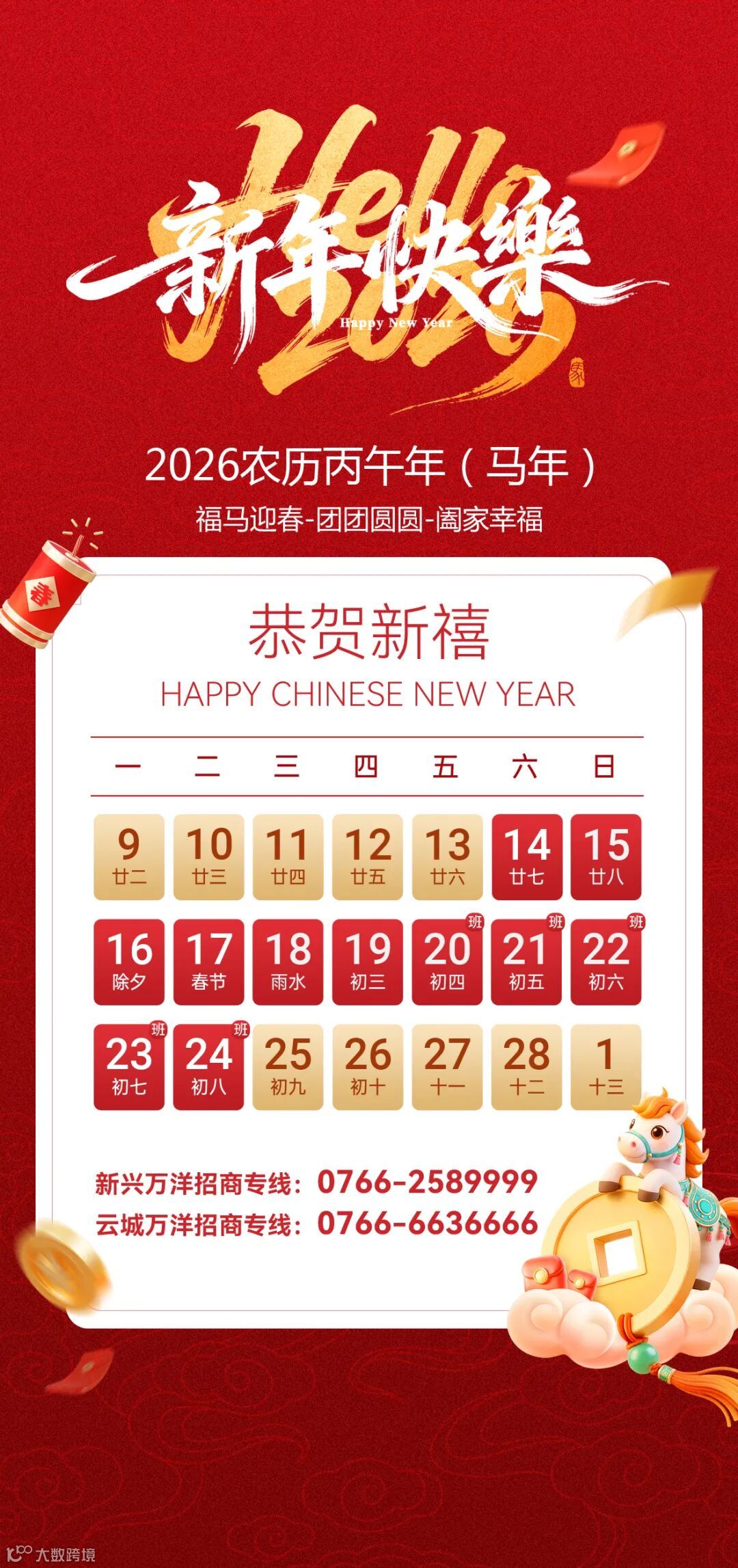 过去一年,感谢大家对云浮万洋新兴与云城项目的支持与厚爱。新的一年,愿您如骏马奔腾,乘势而上,在云浮万洋的沃土上拓宽赛道、驰骋商海、马力全开、订单长虹!