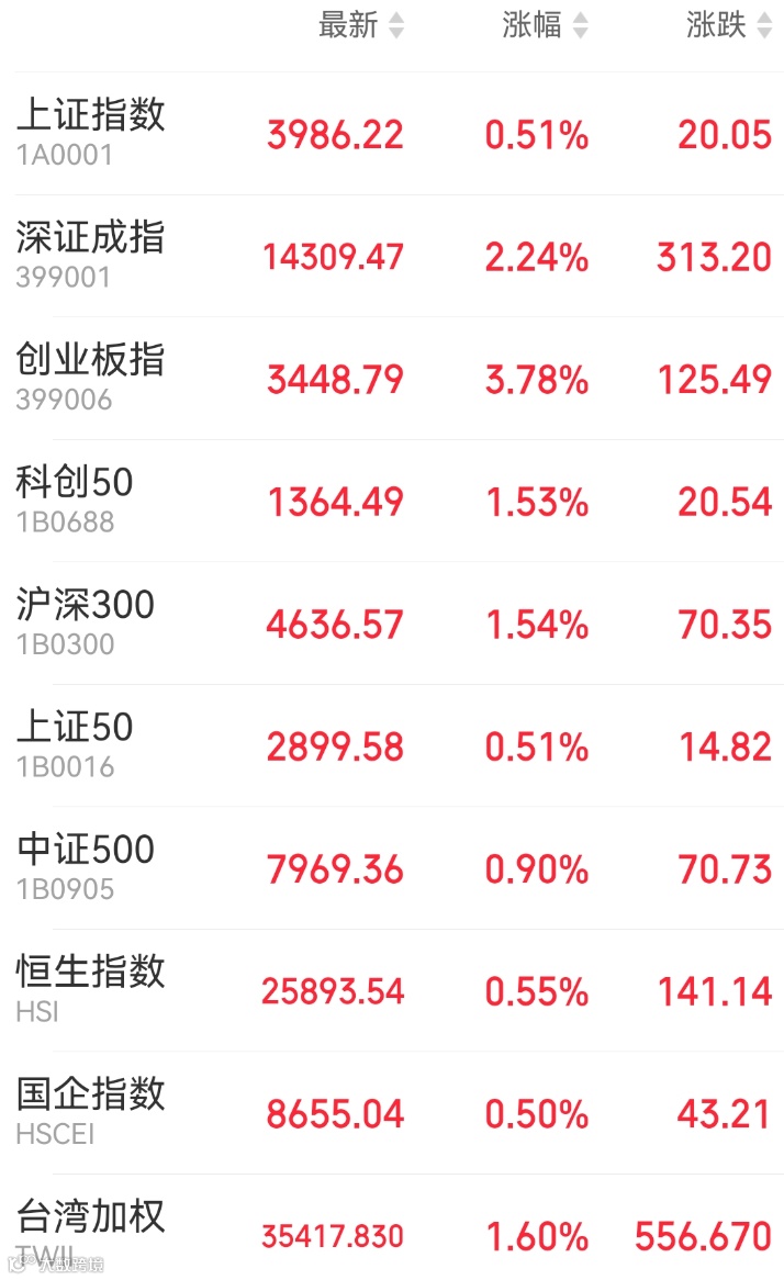 1、A股:A股震荡走高,上证指数收涨0.51%报3986.22点;创业板指涨3.78%,刷新2021年底以来收盘新高;深证成指涨2.24%,万得全A涨1.17%,市场成交额2.34万亿元。动力电池产业链、稳定币概念爆发,券商、电工电网、半导体板块涨幅居前,航运、有色板块低迷。
