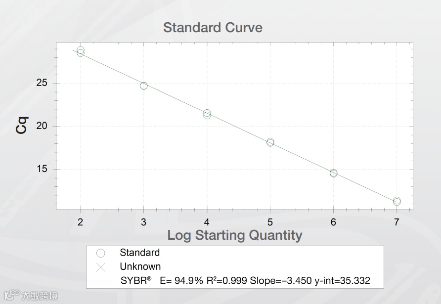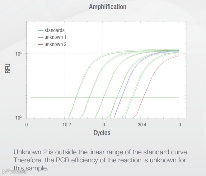 标准曲线用于确定 qPCR 检测方法的扩增效率、线性范围和重现性。这些值仅对用于生成标准曲线的系列梯度稀释内的浓度范围有效。如果样品的 Cq 值超出了系列稀释液的 Cq 值范围,则不能推断线性范围以外的扩增效率。