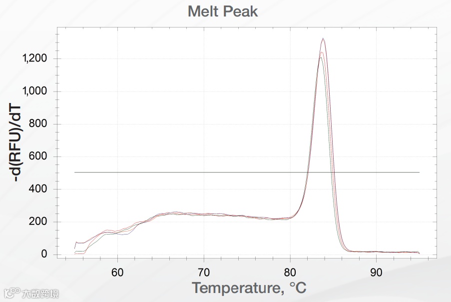 图2: 熔解峰可验证引物对的特异性。特异性检测只会扩增一个 PCR 产物,因此只有一个峰。多个峰表有示多个产物,如非靶标扩增子或引物二聚体。纠正脱靶扩增可采用更高的 Ta,也可能需要重新设计引物。