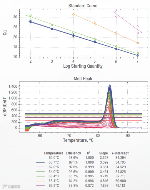 使用温度梯度功能测试引物在目标温度 Ta 附近的温度范围(例如,对于目标温度 Ta 为 60°C 的引物,测试温度为 55-65°C)