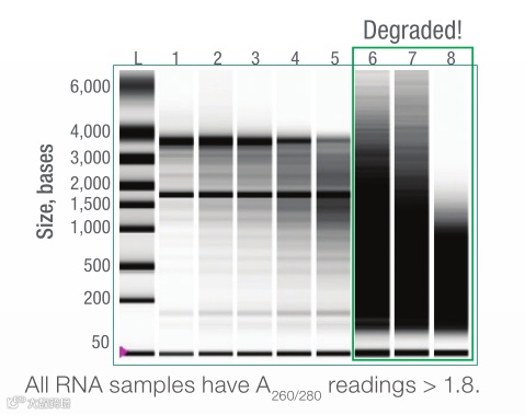 说到 qPCR,垃圾进 (garbage in)=垃圾出(garbage out)。降解或受污染的 RNA 会产生低质量的 cDNA,从而导致 qPCR 扩增效率低下,并产生不准确的低质量数据。