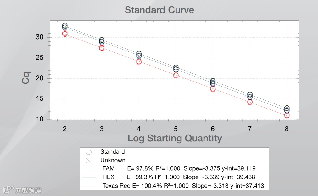使用5个数量级(5倍或10倍稀释)的标准曲线确定 PCR 扩增效率,且每个梯度重复三次,以确定 assay 的扩增效率、线性动态范围和重现性