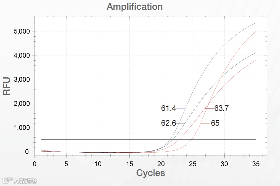 图1: 使用阳性对照样本,利用温度梯度进行引物的检测优化。在此例,61.4°C 是最佳温度,因为它是 Cq 最低时所对应的最高温度(此时 Cq 为 21,而更高温度对应的 Cq 为22和25)。