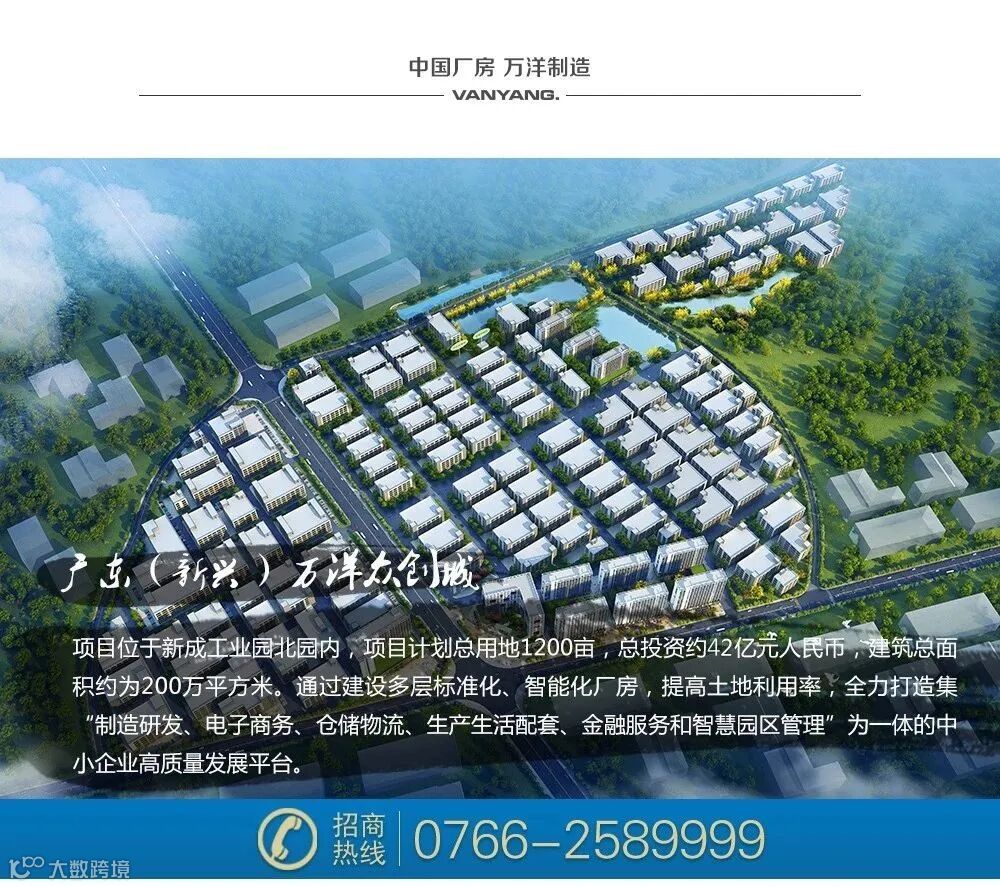 广东(新兴)万洋众创城项目位于新兴县新成工业园北园,项目计划投资42亿元,计划用地1200亩,计划总建筑面积约200万平方米,预计可容纳300家企业入驻,创造25000个就业岗位。项目从2018年开工建设,一期开发面积197亩,已全面结顶,二期占地445亩,目前正在紧密建设中。