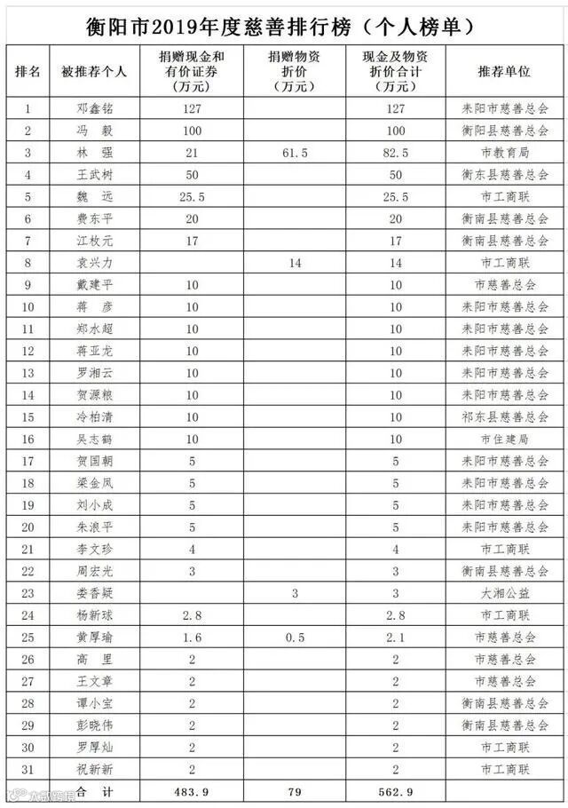 衡阳市2019年度慈善排行榜(个人榜单)