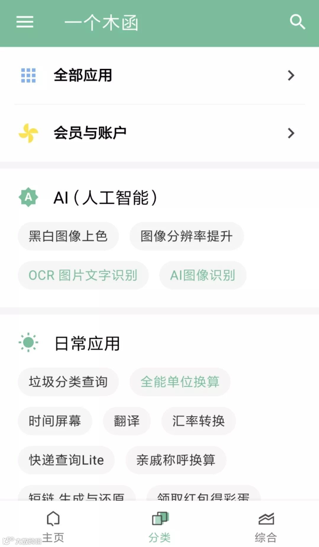 一个木函是一个小巧清新的多功能工具聚合软件。它采用极简设计,简洁的界面,轻量的体积,没有推送和唤醒,就是一个纯粹极简的工具聚合软件。它聚合多达60多种实用工具,并且精心分类,包括:日常应用、图片应用、第三方应用、设备应用、清理应用、转码应用、其它应用。