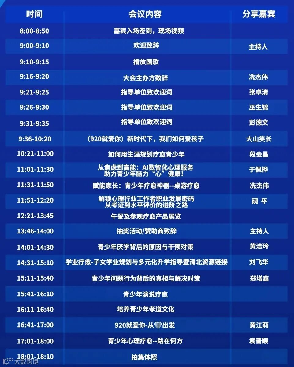 由中国食品工业协会海洋水产食品专业委员会广州办事处、广东省商业联合会文化创意及礼品产业专委会、广州市社会心理公益协会指导,广东省青少年素质教育研究院、广东佰世传承控股(集团)有限公司主办,广州鼎幸福文化科技有限公司、佛山市芯彤人生蓝图教育咨询有限公司承办,广州愈界健康管理咨询有限公司、伴伴心空间(广州)健康管理有限公司协办,烨开心健康管理服务 (佛山) 有限公司、广东佰世传承婚恋情感咨询有限公司赞助的《中国首届青少年身心健康和疗愈经济产融发展大会》将于 2025 年 9 月 20 日在广东省举办。