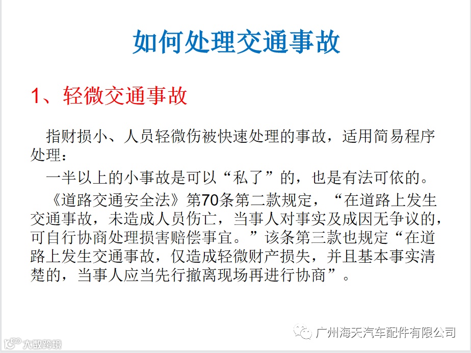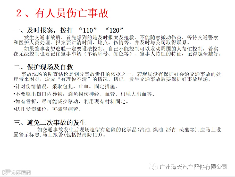 7.在道路上发生交通意外事故后,应立即拨打交通事故报警电话:122报警,保护好现场并转移到安全区域等待交警到来,在上下班途中发生的交通意外事故,应第一时间通知公司部门领导或人力资源部,并按制度填写《事故报告》,经人社局认定为工伤方享受工伤待遇。