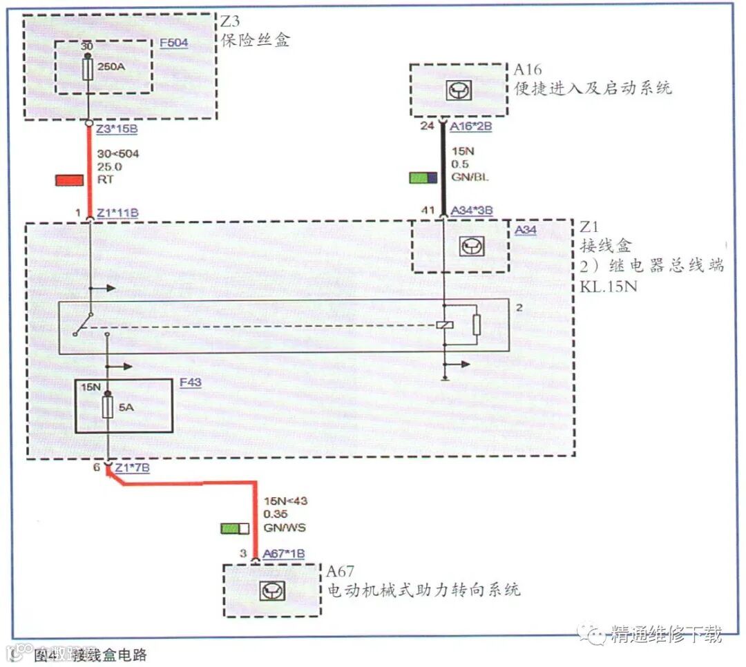 查询F43的供电由Z1中的继电器来控制,如图4所示,可能的故障原因: