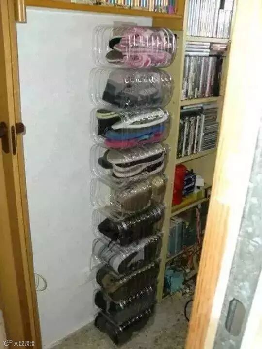 大号的塑料瓶剪下顶部,用来收纳鞋子、围巾、皮带也是极好的。