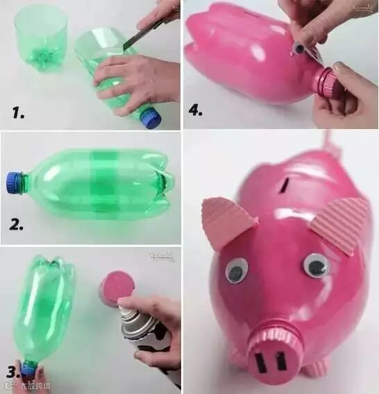 将塑料瓶中间一段剪下,保留首尾两截,用热熔胶黏上,用小刀在瓶身出剪出一条小口用来投放硬币,最后加上眼睛、鼻子、耳朵的装饰。