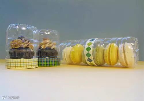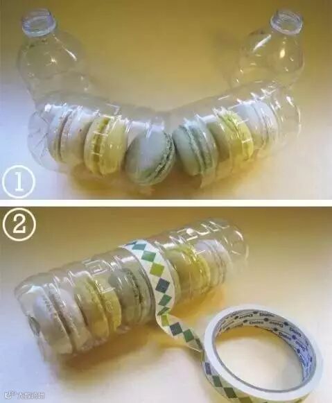 两个干净的塑料瓶从中截断,把饼干装进瓶中,对齐塑料瓶的开口处,用胶带反复缠绕几次。