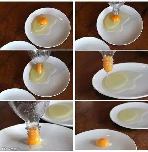 拿一个干净的塑料瓶,将瓶口对准蛋黄的同时挤压塑料瓶,就能将蛋黄与蛋清完美分离。