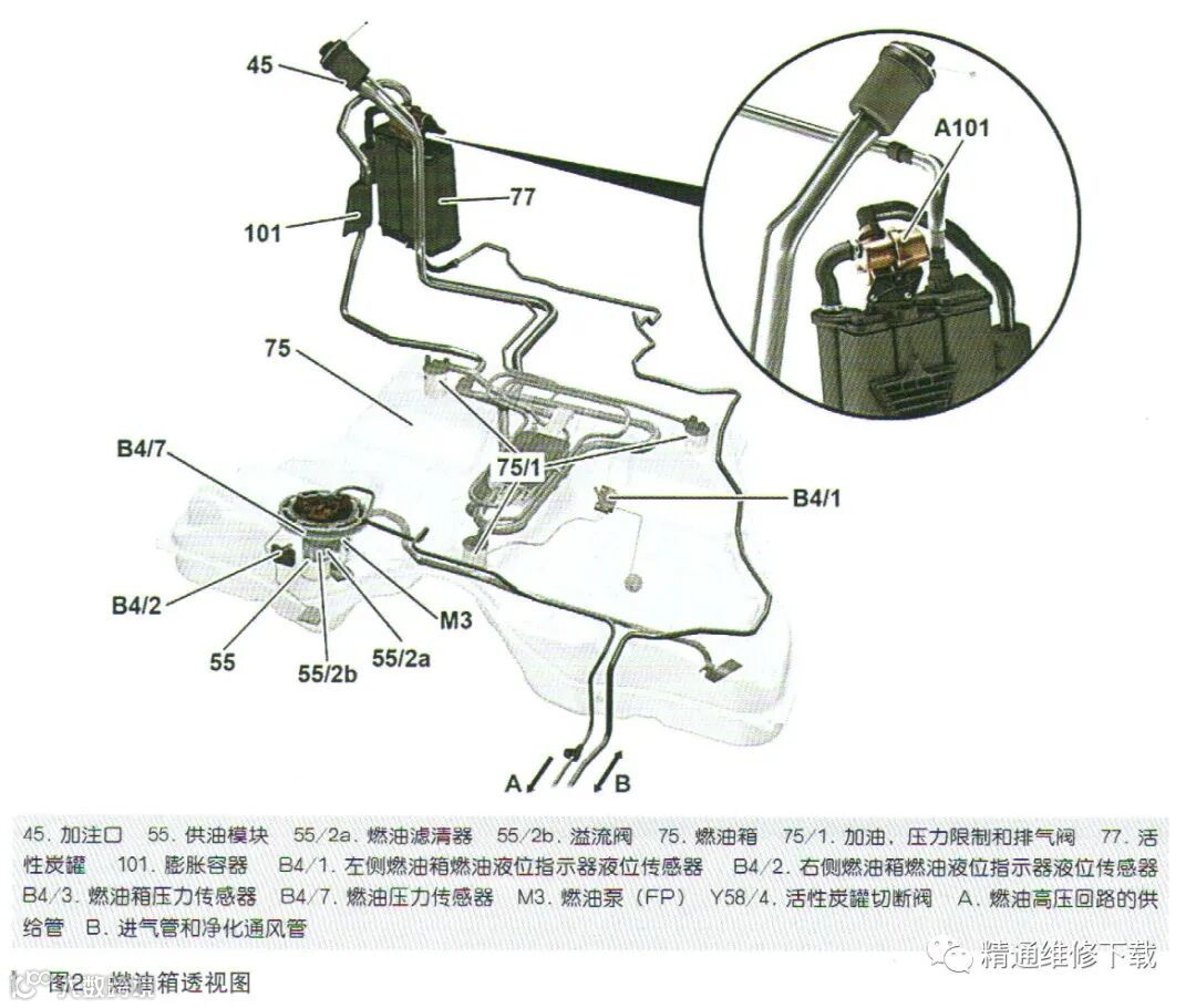 如果A101检测出以下情况:①油箱盖没有拧紧;②油箱盖密封圈破损;③炭罐电磁阀、炭罐、燃油箱诊断模块(A101)、油箱这几个部件之间管路接头或管路有泄漏点;④油箱上的的油泵单元处有泄漏点,比如插头插壳漏气;则N3/10可能会设置故障码P04427A一识别到燃油挥发排放控制装置内微小泄漏,识别到泄漏或密封件损坏。