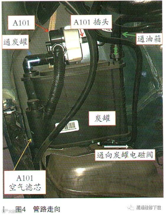 故障排除:更换蒸发排放控制系统诊断模组A101(如图5所示)后经过1周的观察,故障不再出现。