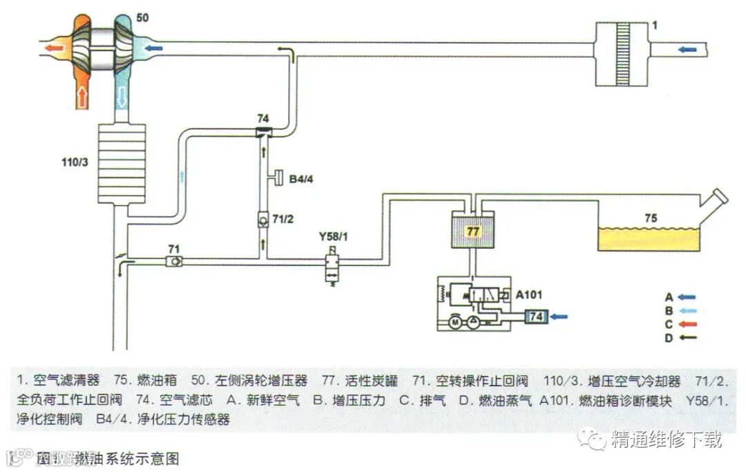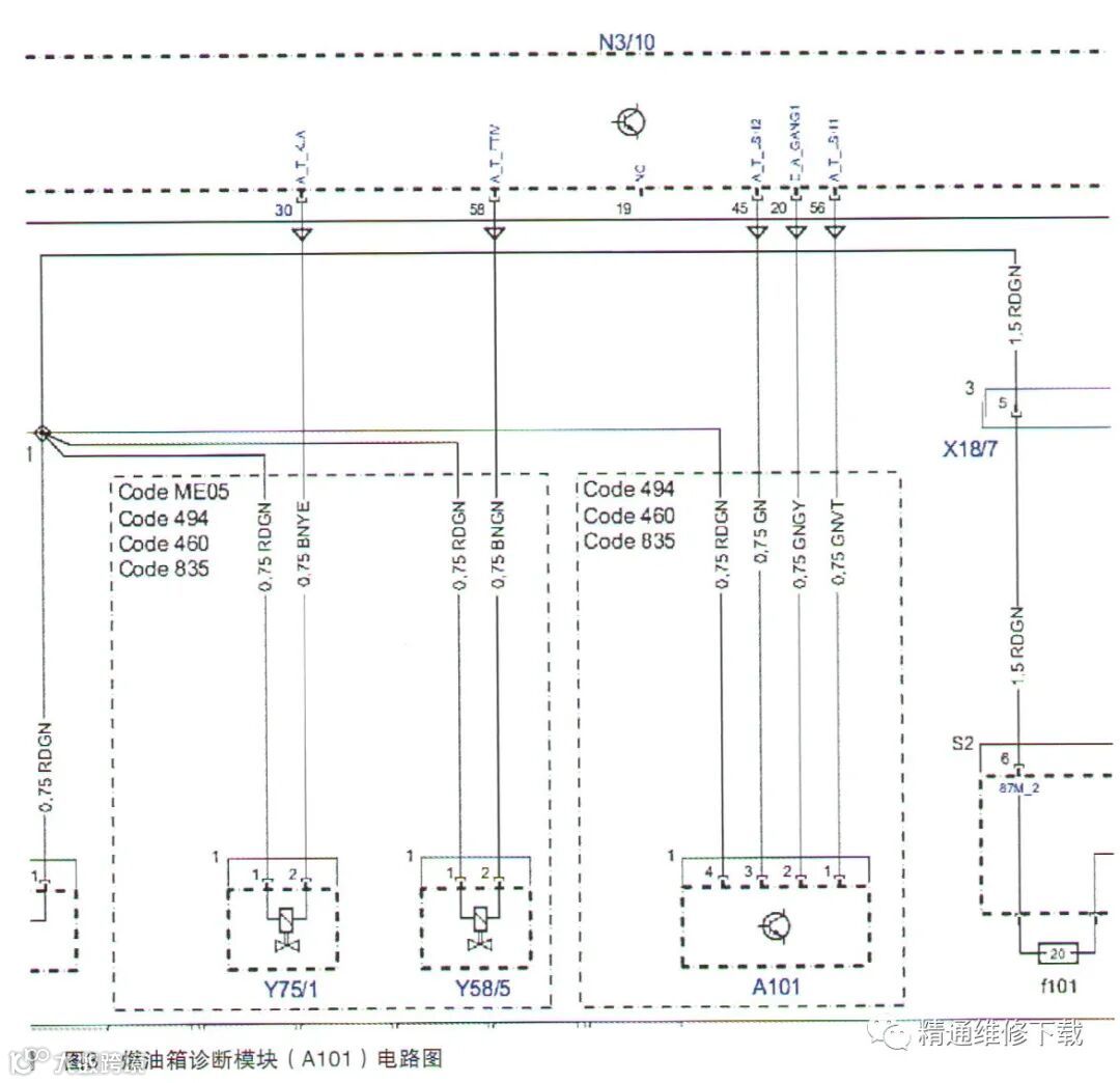 带泄漏测试的净化系统工作原理如下:发动机控制单元(N3/10)对超过与未超过燃油箱诊断模块(A101)中参考泄漏时燃油箱中形成过压期间的耗电量进行比较,以检查燃油箱的密封性。为了避免因凝结或结冰导致错误测量,通道作为参考泄漏点通过燃油箱诊断模块加热元件(A101r1)加热。净化转换阀(就是炭罐电磁阀)必须关闭(转换阀未被促动二净化被抑制)。